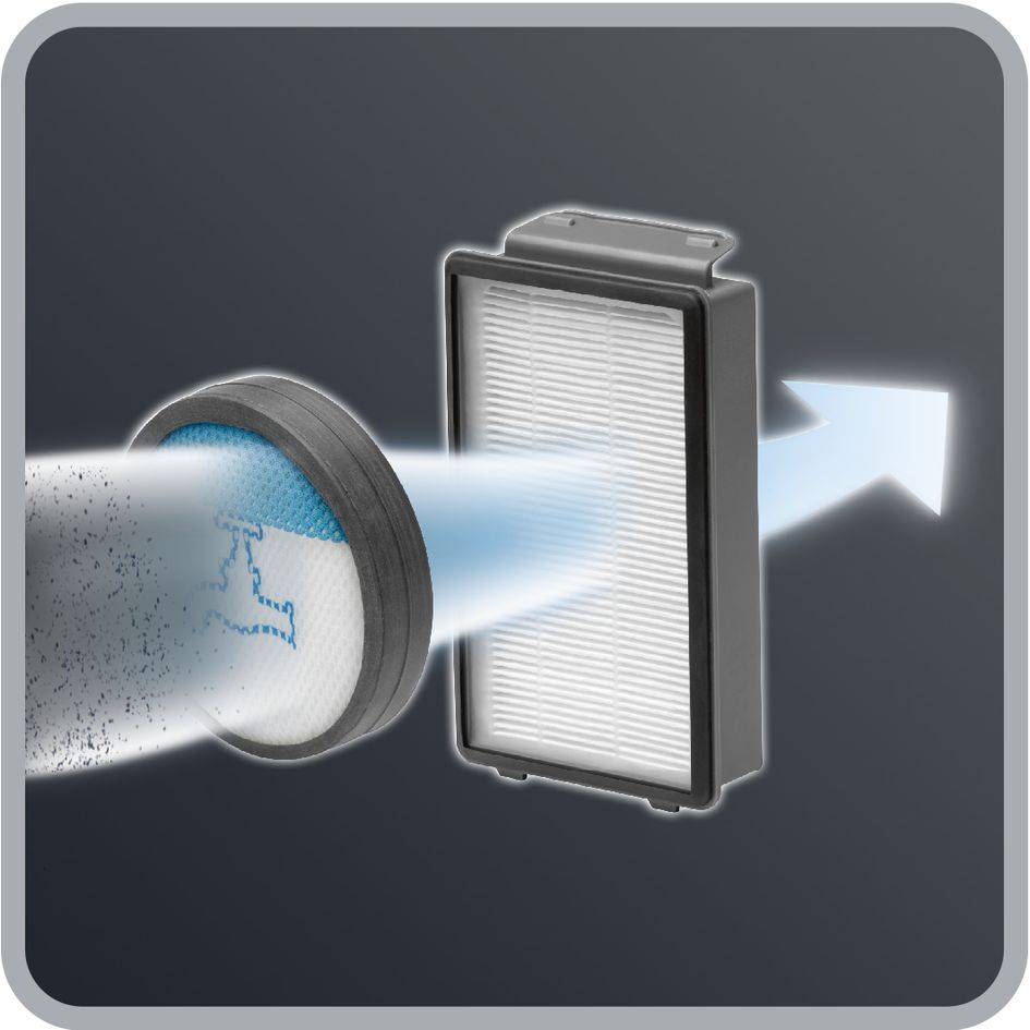 La scopa elettrica con filo Powerline Extreme Cyclonic garantisce un'efficace rimozione della polvere dalle superfici dure e piatte quali i pavimenti di legno o piastrelle e risultati di filtraggio ottimali, limitando al contempo il consumo di energia.
